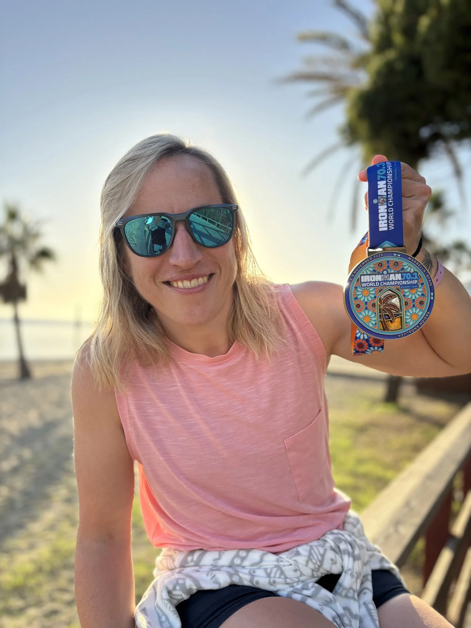 Post-race reflection - Nat celebrating with her medal on Marbella beach.