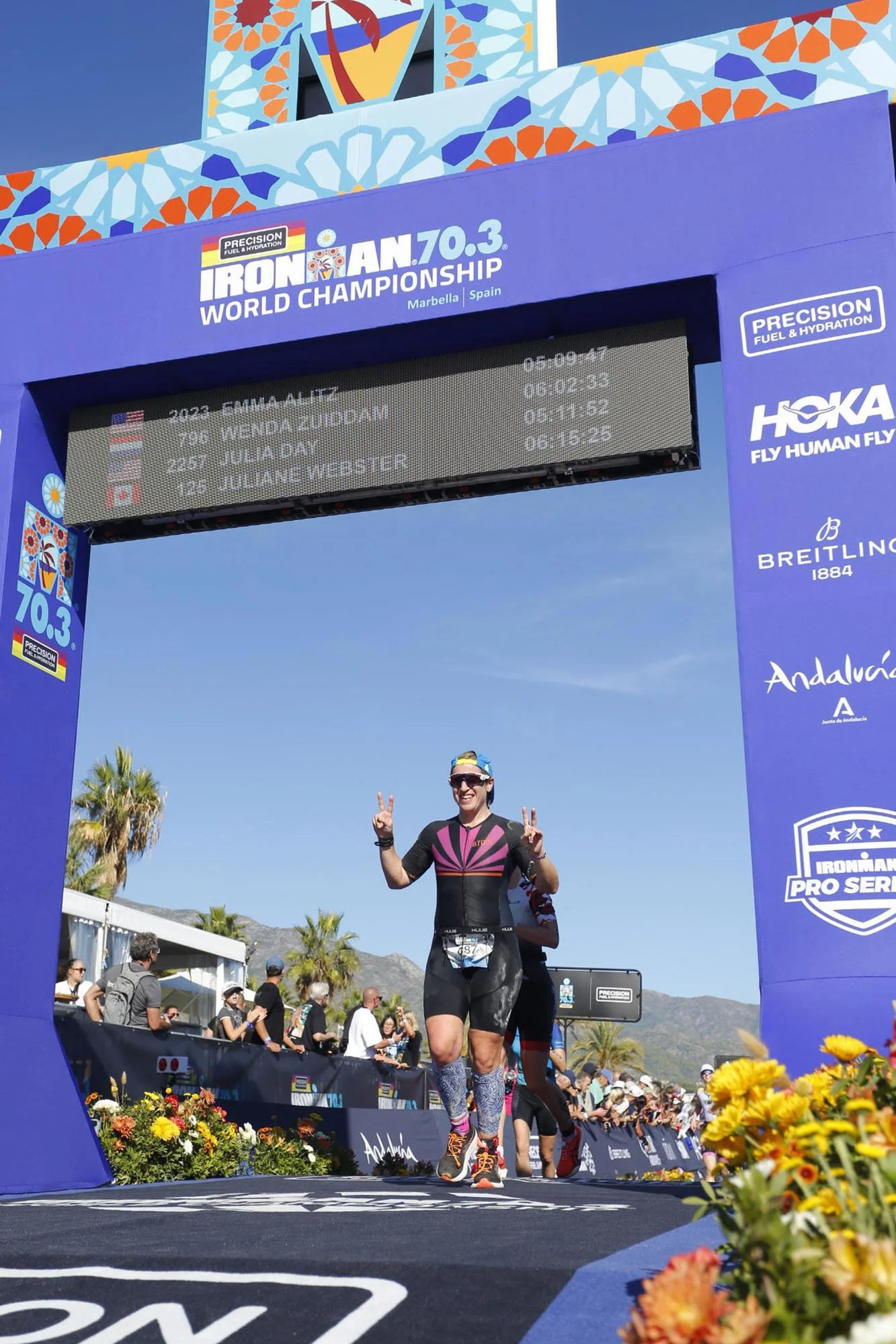 Crossing the finish line in Marbella.