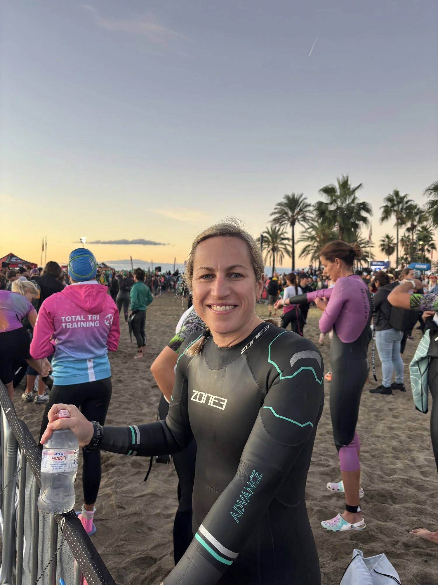 All smiles before entering the cold, rolling waves for the 1.9 km swim in the Mediterranean.